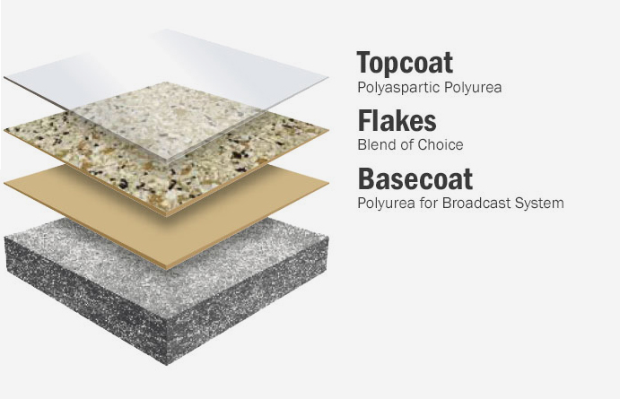 Unlike an epoxy garage floor coating, our chip system uses 100% Polyurea—a material that’s much stronger and more flexible. With a Polyurea basecoat and topcoat, our chip flooring is resistant to abrasions, chemicals, and UV damage.